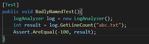 در این مثال، Assert از عدد جادویی 100- استفاده می کند (عدد جادویی یعنی عددی که در Assert آمده و در نتیجه تست مهم است و توسعه دهنده یا خواننده تست باید بداند که چه معنی ای دارد اما در تست مشخص نشده است که این عدد چه معنی ای دارد). چون نام این تست توضیح مناسبی برای عددِ نتیجه تست ندارد، فقط می توانیم فرض کنیم که معنی عددِ نتیجه چیست و اطمینان نداریم.