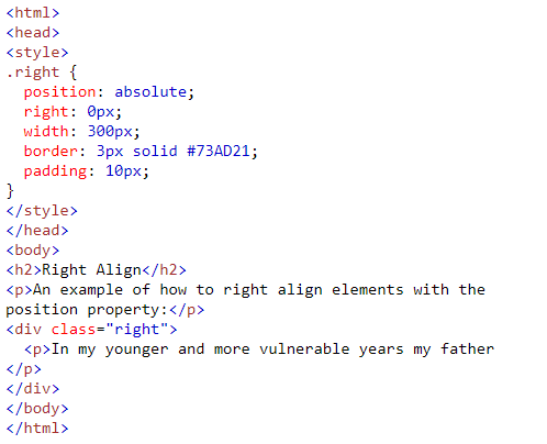 یک روش برای تغییر دادن مکان عناصر، استفاده از ;position: absolute می باشد. در این روش شما با استفاده از مقادیر left و right می توانید جایگاه عنصر موردنظر را تغییر داده و به سمت چپ و راست هدایت کنید. مثال زیر نحوه انجام این کار را نشان می دهد: